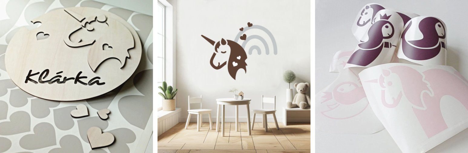 Dekorace na téma jednorožec? No jasně, ne jedna holčička má období, kdy chce být obklopenatěmito bájnými zvířaty. Ti naši však nejsou jak z cukrové vaty, přesto jsou něžní a lásky plní. Budou tak Vaši holčičku ochraňovat. V klidu je můžete nakombinovat i s klučičím motivem, třeba dinosaury či auty pro brášku. O to mi při jejich navrhování šlo. Jednorožce může krásně doplnit duha a srdíčka.