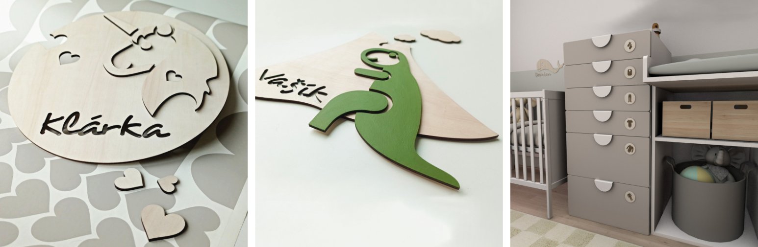 Objevili jste dětské dřevěné dekorace v unikátním autorském designu. Naše dětské dřevěné doplňky, zejména ty přírodní bez barvy, přinesou do dětského pokoje přírodu a útulnost. Najdete u nás dekorace ve stejném designu jako ostatní produkty. Můžete tak nakombinovat dětské dřevěné dekorace, samolepky, plakáty či polštářky na stejné téma.