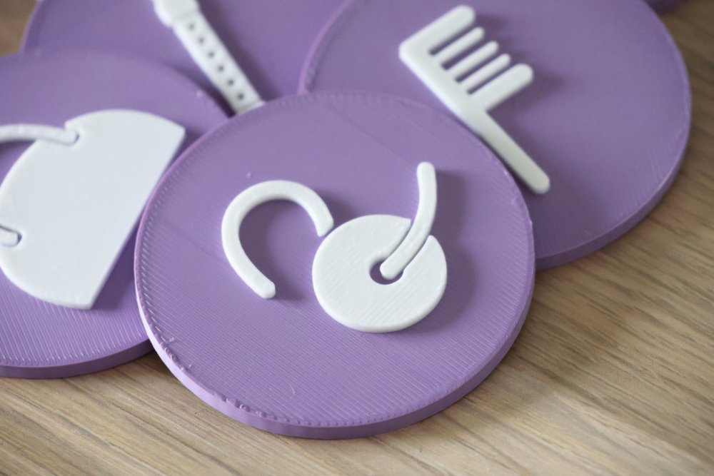 Rozlišovací štítok, ceduľka s piktogramom na box či šuplík s korálkami.